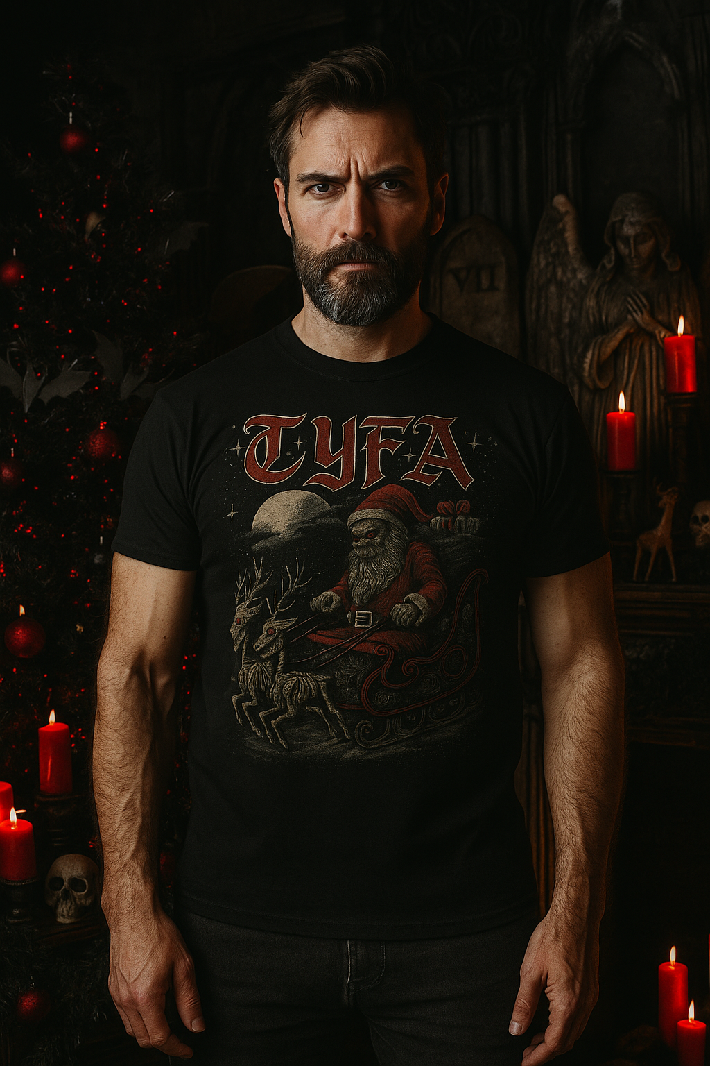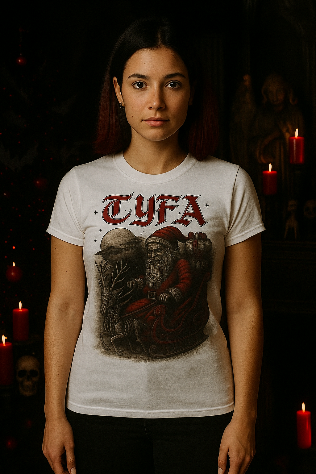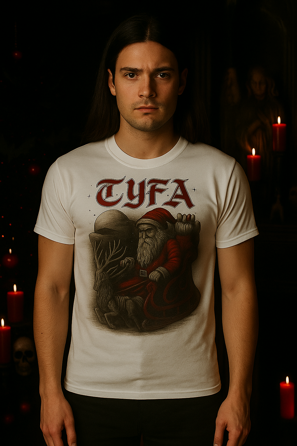 Ce design exclusif met en scène un Père Noël démoniaque conduisant son traîneau tiré par des rênes squelettiques, sous une lune sanglante. Parfait mélange entre l’horreur et la magie de Noël, ce vêtement capture l’essence du style gothique Tyfa : audacieux, mystérieux et macabrement festif.